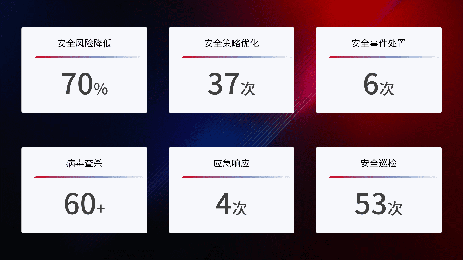 提供全面的安全事件报告体系,,包括处置报告、、、、周报、、、季度和年度总结,,,结合持续监控,,,帮助客户深入了解网络安全状况。。