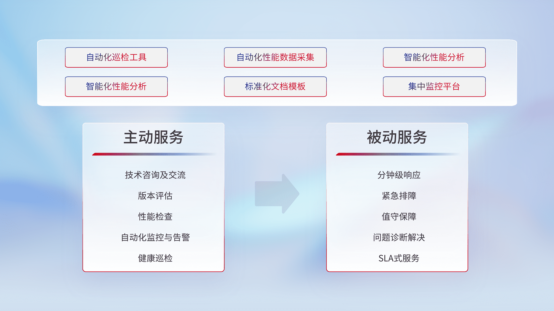 智能化工具和标准化文档,,,保障服务质量,,,,提供主动服务(包含技术咨询、、、版本评估、、性能检查、、自动化监控与告警、、、、健康巡检)和被动服务包含(分钟级响应、、、、紧急排障、、、值守保障、、、问题诊断解决、、、SLA服务)。。。。